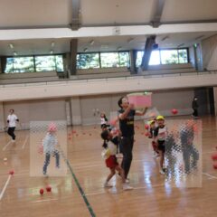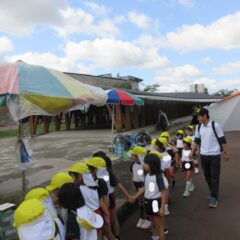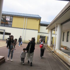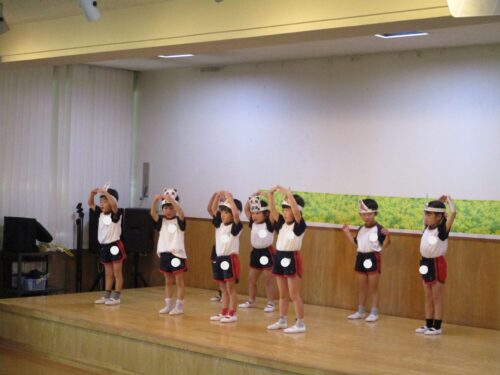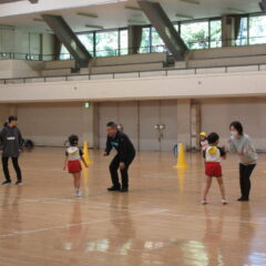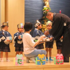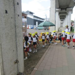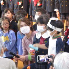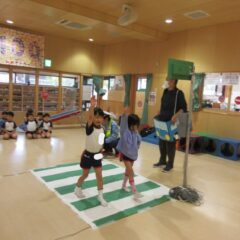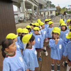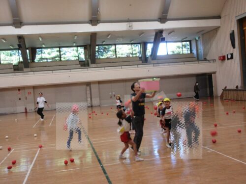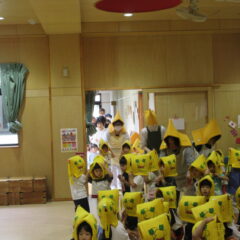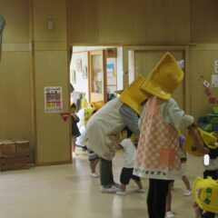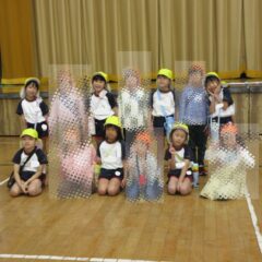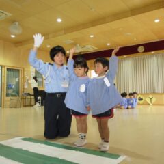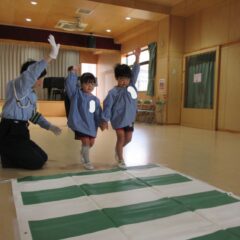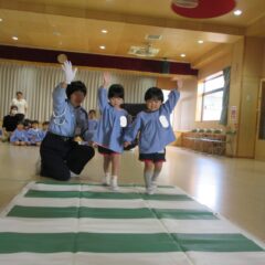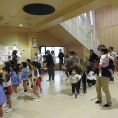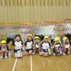 10月24日、同じ学区の裏館保育所、宝塔院幼稚園の年長さんと一緒に運動会をしてきました。かけっこ、追いかけ玉入れ、ジャンケンレース、せんべい食い競争、などなど沢山の競技をし、その後同じチームのお友達でせんべいを食べ休憩。その中ではいつの間に仲良くなったのか、「〇〇小学校に行くんだ」「僕も」と会話したり、あっちむいてホイをする様子も見られました。みんなで写真撮影をし終わりました。小学校で会えるといいね。