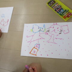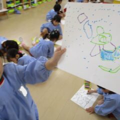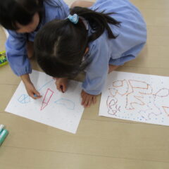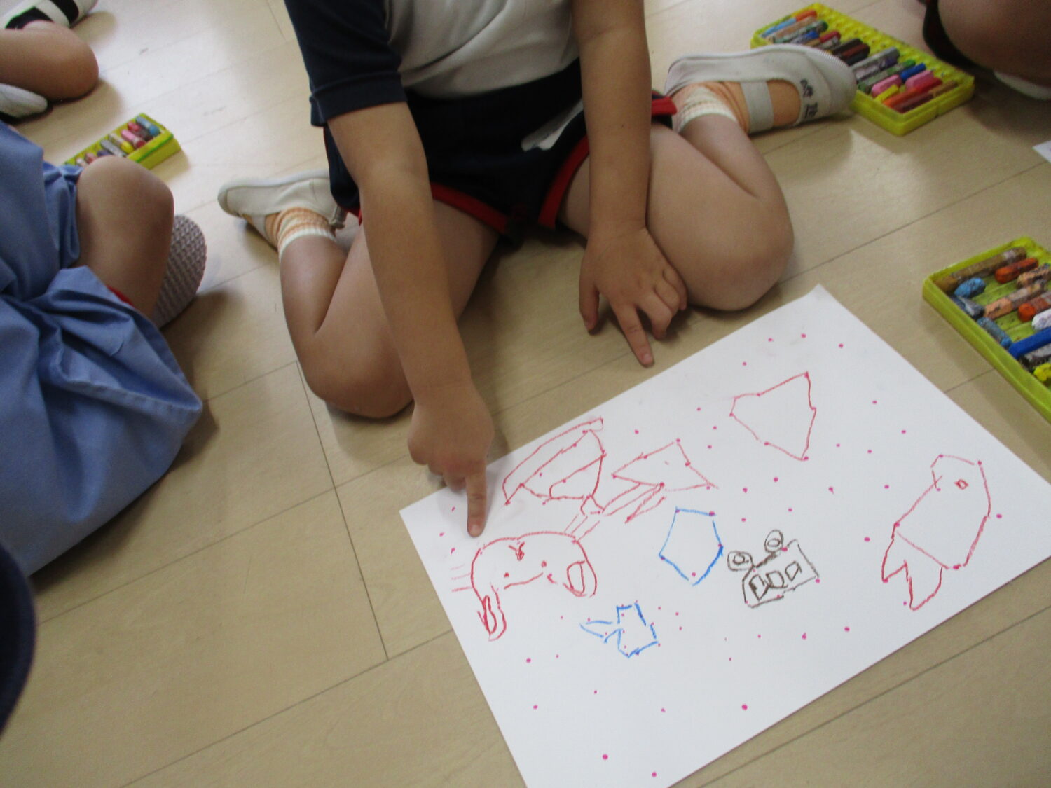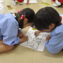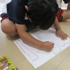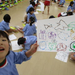 年中さんが点つなぎ遊びをしています。点々をつなげていくと、わー、かわいい絵が出てきましたね。