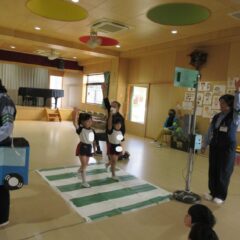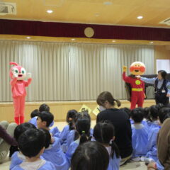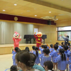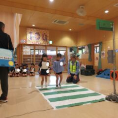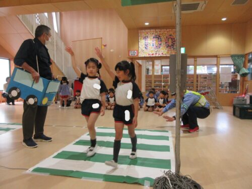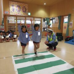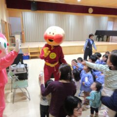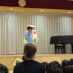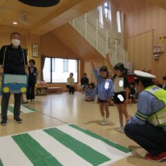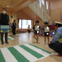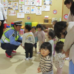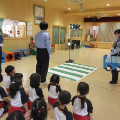 10月27日、交通安全教室に参加しました。警察署、三条市生活安全課の方々にお越しいただき信号の見方、横断歩道の渡り方などご指導くださいました。又、アンパンマン、ドキンちゃんも遊びに来てくれ小さいクラスは大喜びでした。