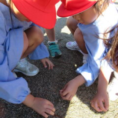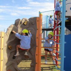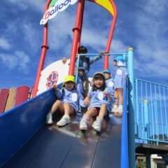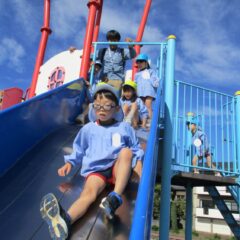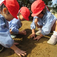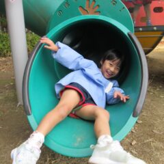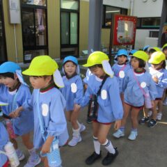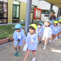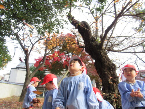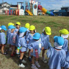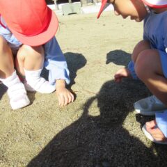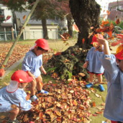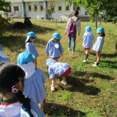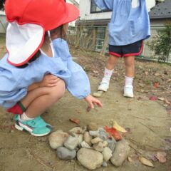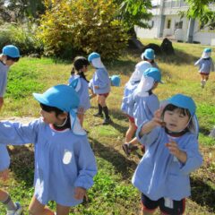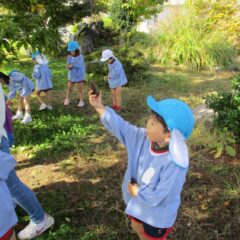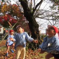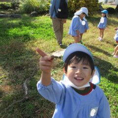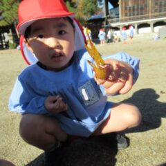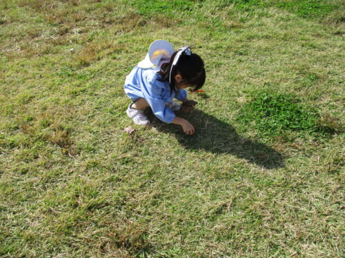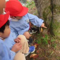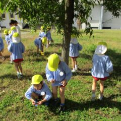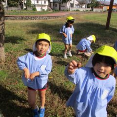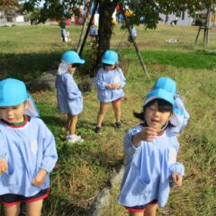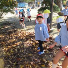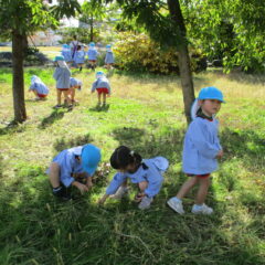 年中・年長組のお兄さん、お姉さん達もあそぼってまで出かけてきました。みんなはどんぐり拾いに夢中!持って帰ってきて年長さんはどんぐりこまを制作し一生懸命回していますよ。