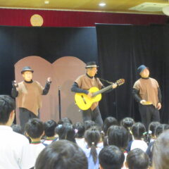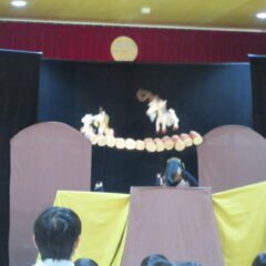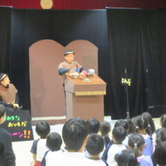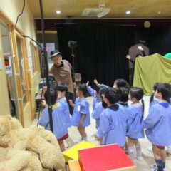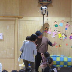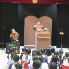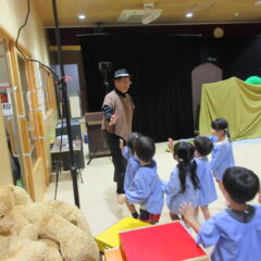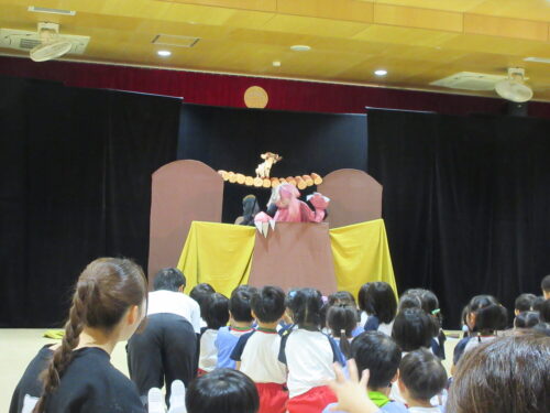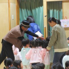 11月10日、人形劇団「とんと」さんが遊びに来てくださいました。上演題材は「おおきなおいもだドッカーン」「三匹のヤギのがらがらどん」。劇団員の方の話し方、演じ方、効果音などとても観ていて聴いていて飽きない楽しい上演でした。がらがらどんの方は少し怖い人形がでてきますが、と前説明してくださり、2~3人のお友達がびっくりしていましたが、劇団員さんの演じ方、話の流れなどとても工夫してくださり最後にはにこにこと観ることができていました。ありがとうございました。