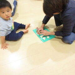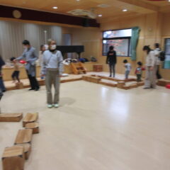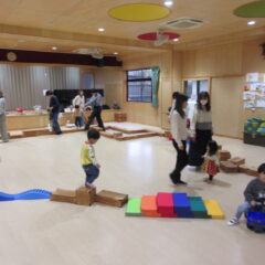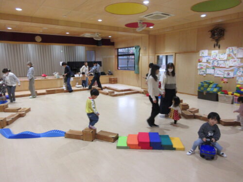 11月11日の親子広場は「迷路で遊ぼう」。年長さんが木の積み木などで作ってくれた迷路で遊びました。