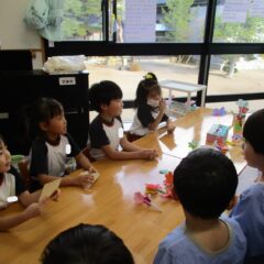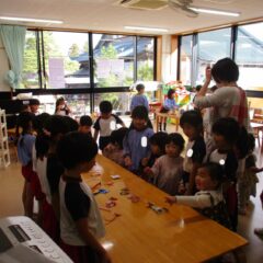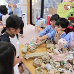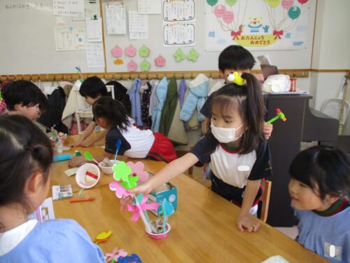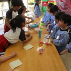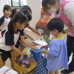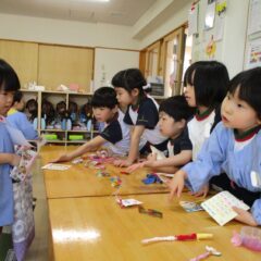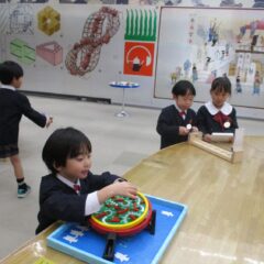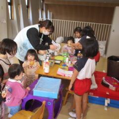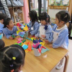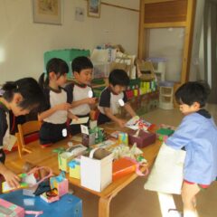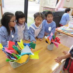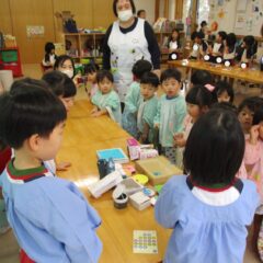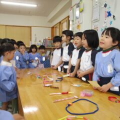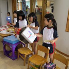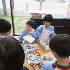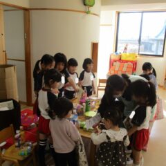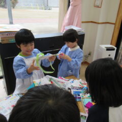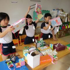 12月15日、年長さんがお店屋さんを開いてくれました。インフルエンザでお休みの多い中、コツコツと品物作りを進め他学年を招待してくれました。それぞれのお店の品物はとても凝っている物が多く、さすが年長さんですね~。(逆光で見えづらいところもありますが)