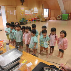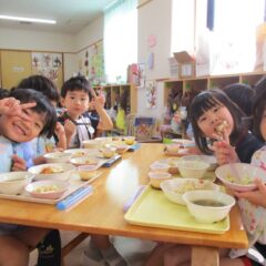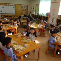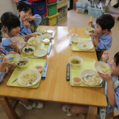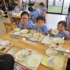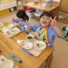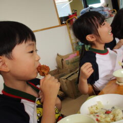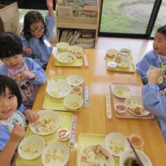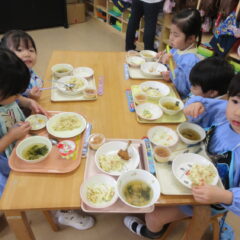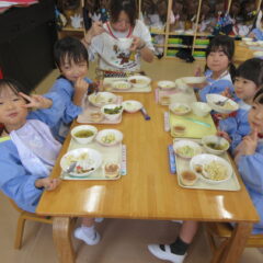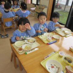終業日の給食は、年少組、年中組さんのリクエスト給食。なんとチューリップやチャーハン、プリン、と大人も大喜びのメニューでした。おいしかったね。