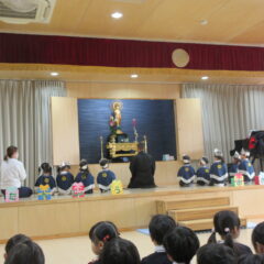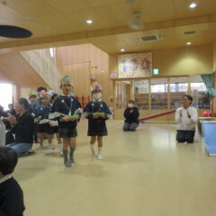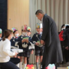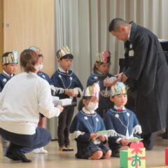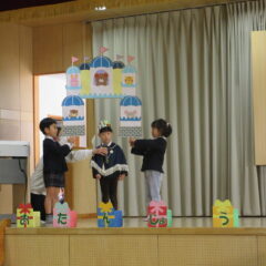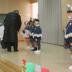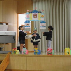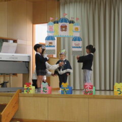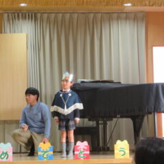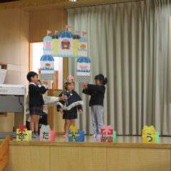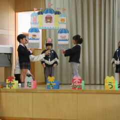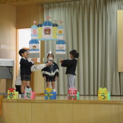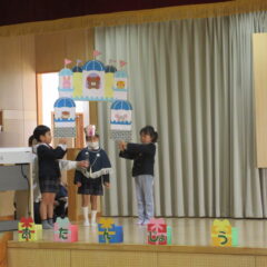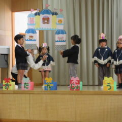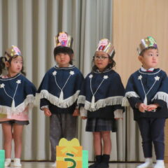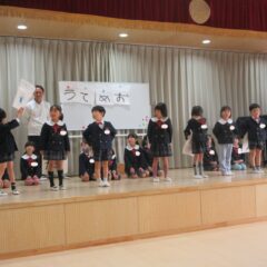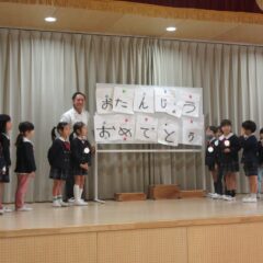 12月12日、12月生まれのお友達のお誕生会。全部で11人のお友達(残念ながら1名お休みでした)、お誕生おめでとう!。そしてアトラクションは年長組さんが、同尾語集めの言葉で「おたんじょうおめでとう」という文字になる言葉遊びを見せてくれました。