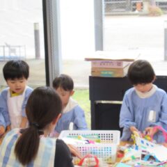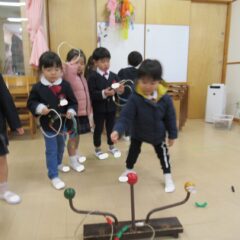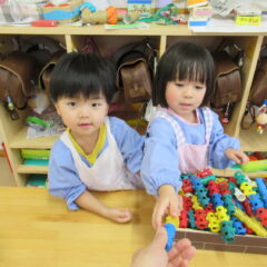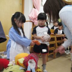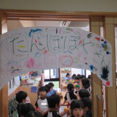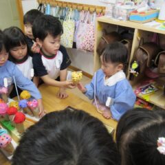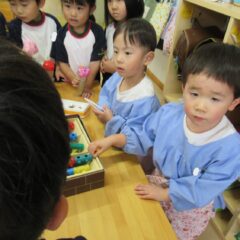 たんぽぽ組さんが年長さんのお店屋さんの経験から自分たちもお店屋さんをしようとお店屋さんを開店。他学年のお友達にも来てもらい楽しそうにあそんでいました。