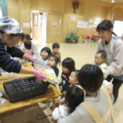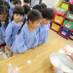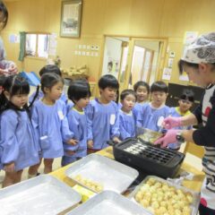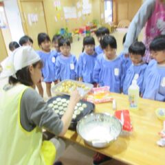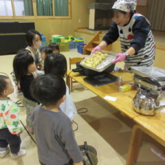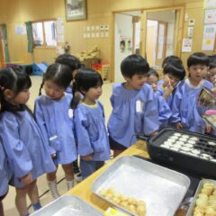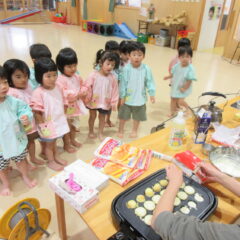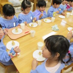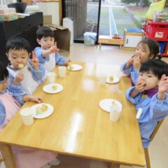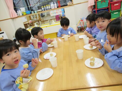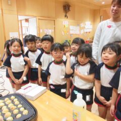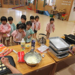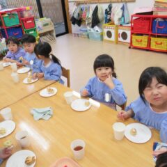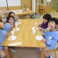 2学期も頑張ったね、とみんなでケーキパーティーをしました。午前中に先生方でたこ焼き器を使ってミニケーキを作りました。午後からはそこに生クリームやお菓子を飾り付け。紅茶(つぼみ組さんは牛乳)と一緒に「いただきまーす」。あっという間におなかの中に。もっと欲しそうな子ども達でした。