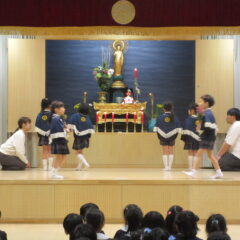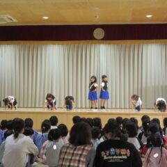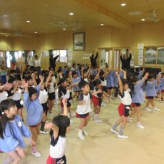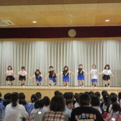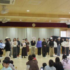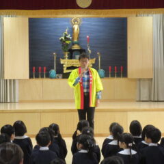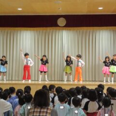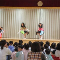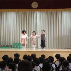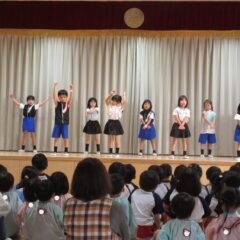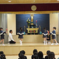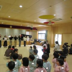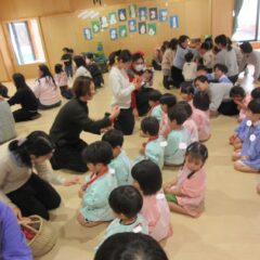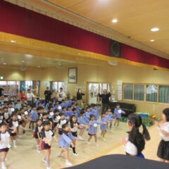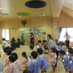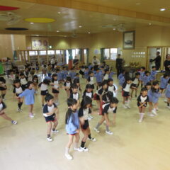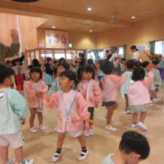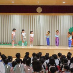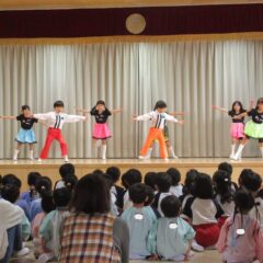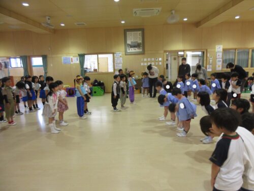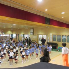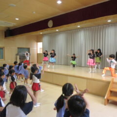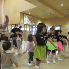 終業式のアトラクションに、年長組さんが発表会の遊戯、舞踊劇を他学年に見せてくれました。発表会当日はインフルエンザが流行し欠席のお友達もいたため、リハーサルには全員そろっての発表を他学年には見せることができませんでした。年長さんは大張きり!再度衣装を着て楽しそうに、そして自信を持って発表をしてくれました。その後、2つの遊戯を「みんなも踊ろう!」と遊戯室では賑やかなダンスタイムに!