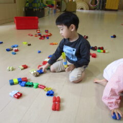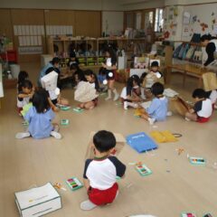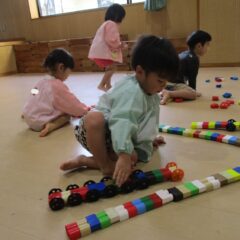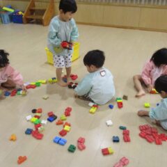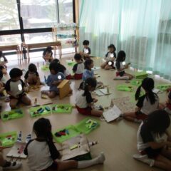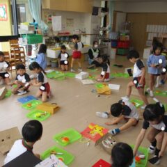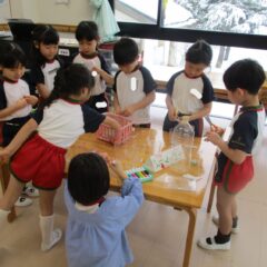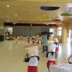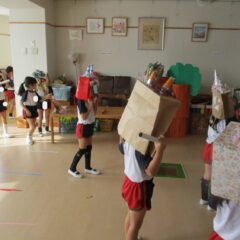 もうすぐ豆まきごっこなのでみんなで鬼のお面(紙袋)の作成です。四角柱の眉毛や三重の目玉、円錐の角など頑張って紙袋に接着。