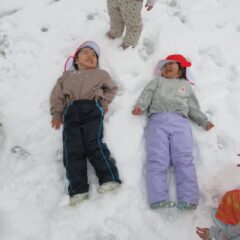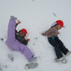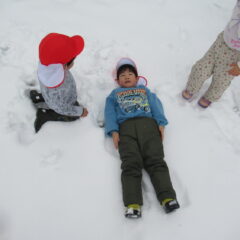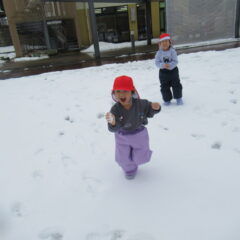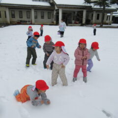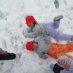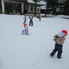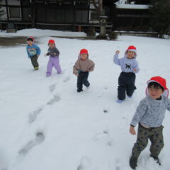 すみれ組さんが雪遊びに出かけました。(広い園庭(境内)で思いっきり体を動かせる場所があるので、子ども達は大興奮!ありがたい!!!)