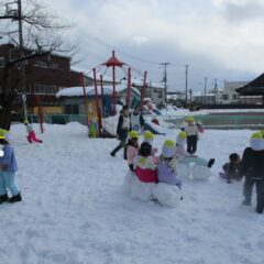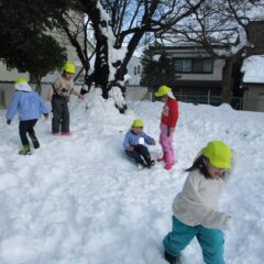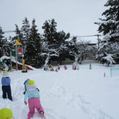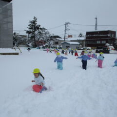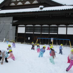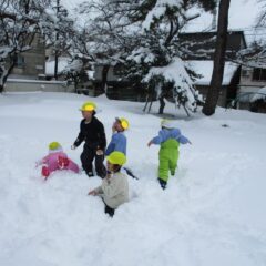 今度は雪遊び!スノーズボンに履き替え、雪の積もっている園庭、境内で思いっきり遊びます。